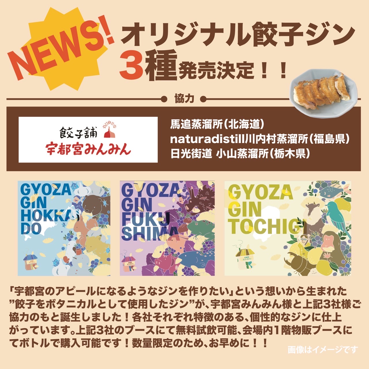 「宇都宮のアピールになるようなジンを作りたい」という想いから生まれた"餃子をボタニカルとして使用したジン"が、宇都宮みんみん様と「馬追蒸溜所(北海道)」「naturadistill川内村蒸溜所(福島県)」「日光街道小山蒸溜所(栃木県)」の3社様ご協力のもと誕生しました!