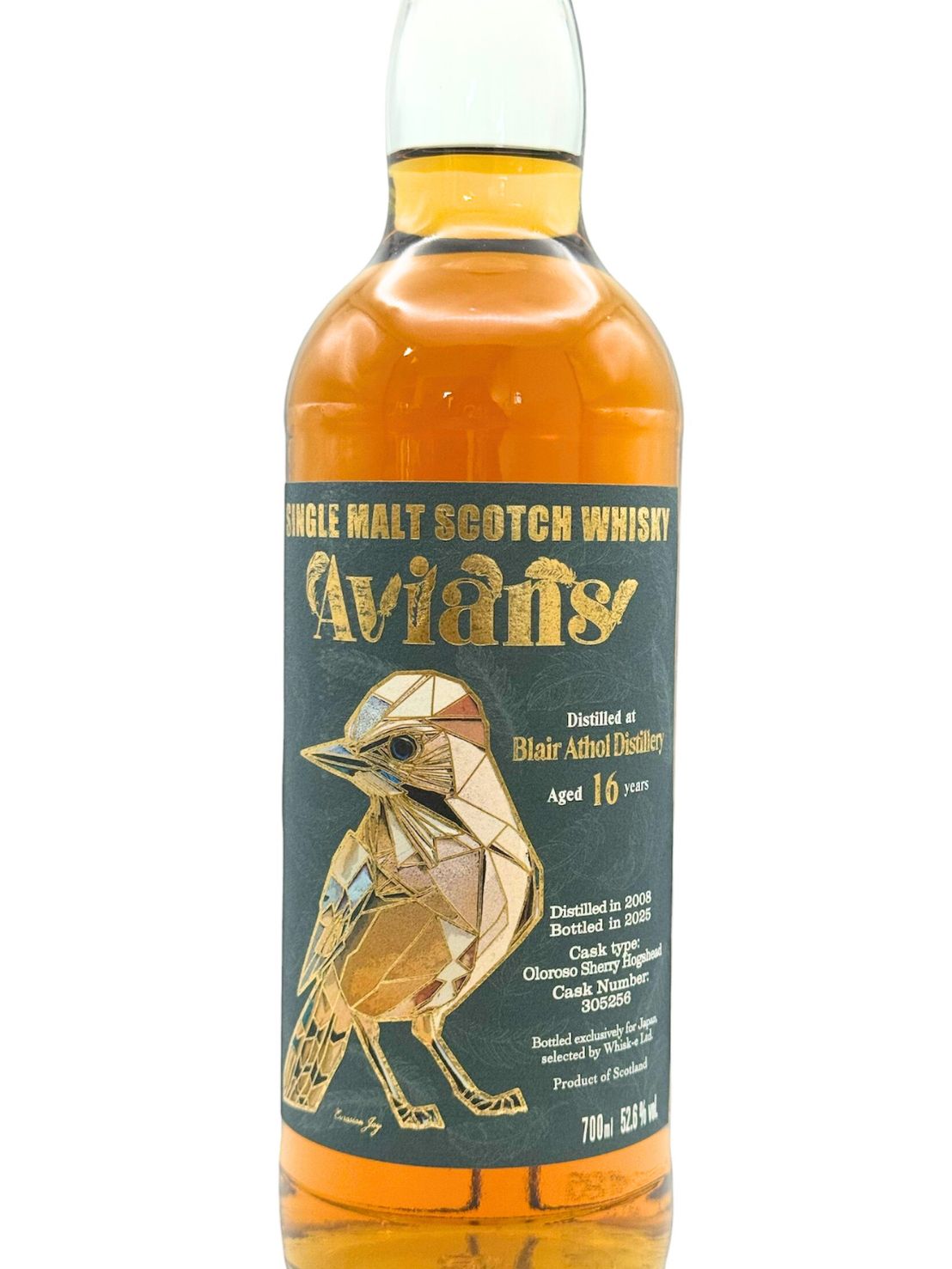エイヴィアンズは、ラベルに美しい鳥の折り紙をモチーフにしたイラストを配したスコッチウイスキーに特化したウィスク・イーのオリジナルシリーズです。色鮮やかでカラフルな様々な鳥たちにお客様のバーやコレクションを彩ってもらいたいという想いを込め、弊社のテイスティングパネルがラベルデザインのイメージに合うフレーバーを持つカスクを選定しました。今回のラベルはユーラシア大陸に広く分布しているカケスです。