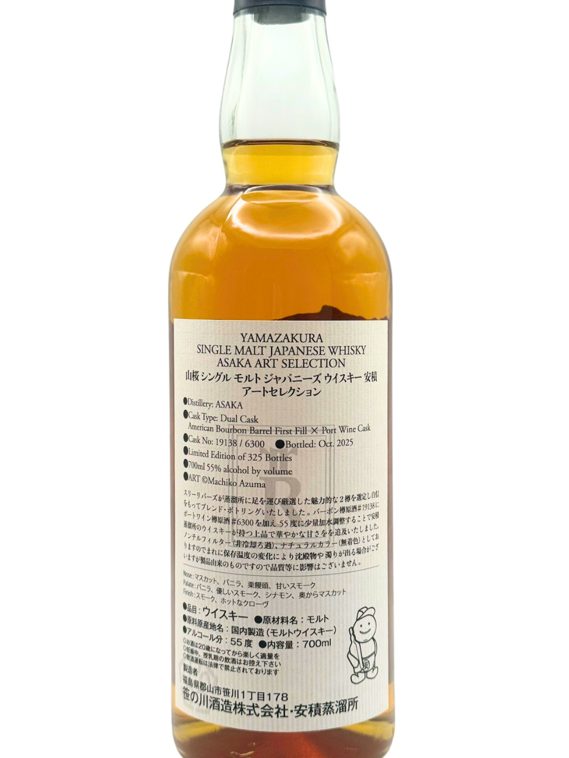安積蒸溜所の歴史は1946年にウイスキー免許を取得した山桜酒造から始まります。1980 年代には親会社である笹の川酒造が販売していた「チェリーウイスキー」も人気を博しました。しかし、その後にウイスキー業界に不遇の時代が訪れ、安積蒸溜所のウイスキーも深い眠りにつきました。2014年、ウイスキーブームの再来により「山桜」として再リリースを飾りました。そんな同蒸留所の中の数多くある樽の中からサンプリングしてチョイスいたしました!今回はノンピートとヘビーピートを50%づつをブレンドして熟成された2019年のバーボンカスクファーストフィルを70%、2019年ノンピートのポートワインカスクセカンドフィルを30%でブレンドしました。熟成年数は2019年蒸留なので6年オーバー、加水にもこだわりこのテイストに最適な55%でボトリングしております。色はディープなゴールデンカラー、安積蒸留所の上品な和の甘さとフルーティーで華やかなテイストをベースにバニラ&スモーク、そこにポートワインカスクのリッチなグレープテイストも加わり、より複雑に立体的な仕上がりになりました!安積蒸留所のご協力のもとブレンドのポテンシャルを更に感じた第2弾プライベートボトルをお楽しみください!